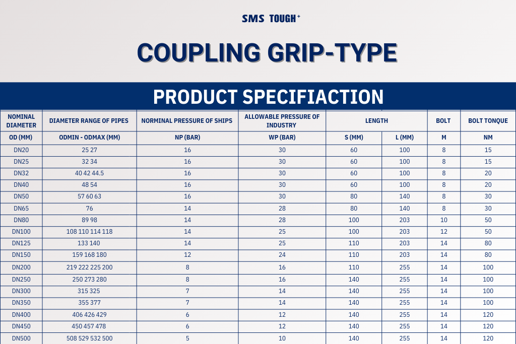 The Coupling Grip-Type is a high-performance pipe coupling made of stainless steel SS304, designed for fast, secure, and flexible pipeline connections. With an internal toothed ring, it provides strong axial resistance, excellent vibration absorption, impact reduction, and enhanced mechanical strength, making it ideal for demanding industrial environments.