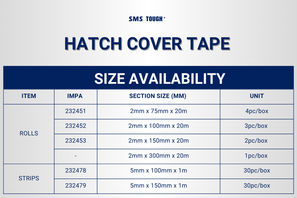 The tape provides excellent watertight sealing for cargo hatch covers and can withstand all kinds of weather and sea conditions. It is also suitable for use on tank covers, weather deck doors and metal pipe protection from corrosion conditions.